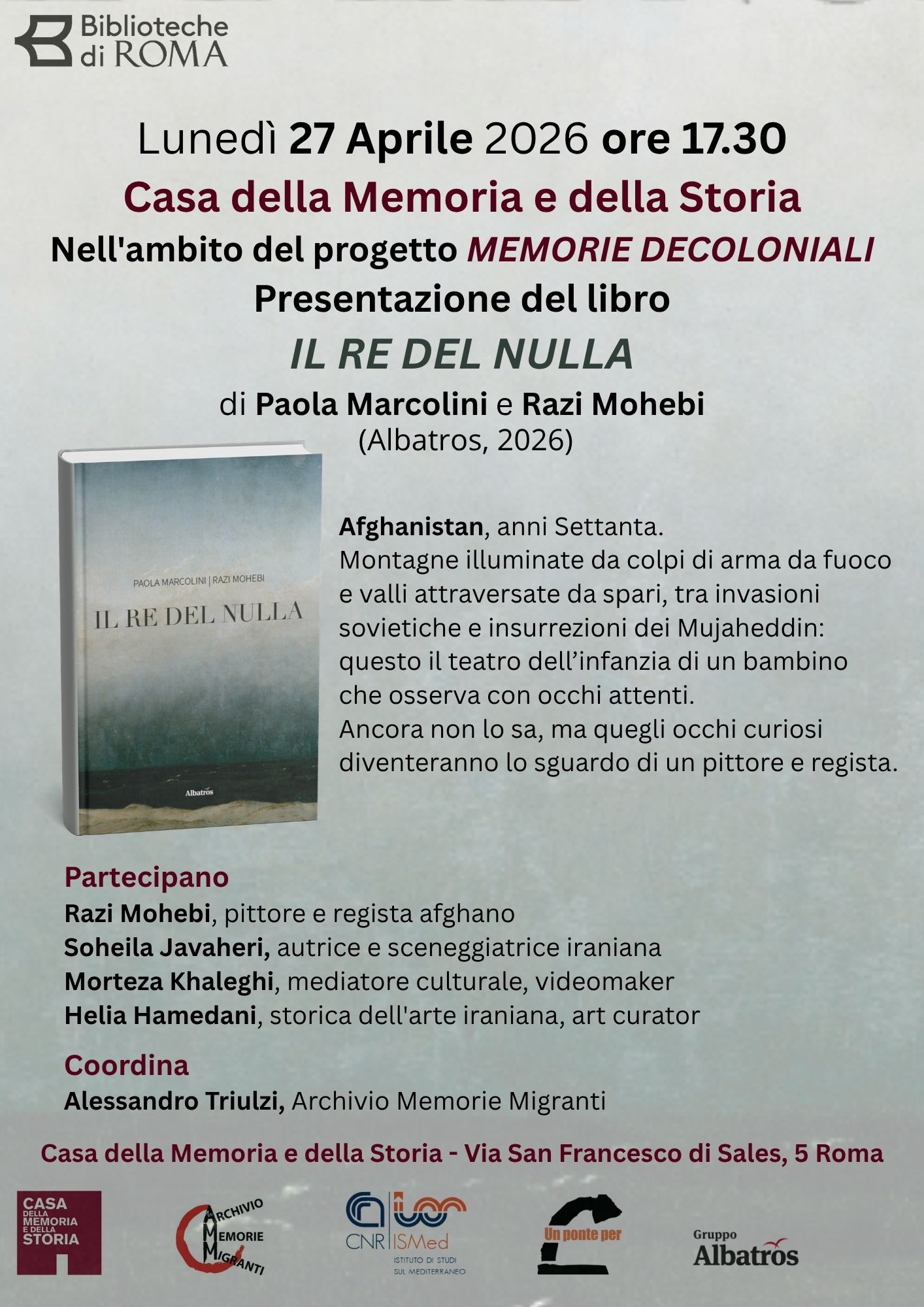 Nell'ambito del progetto Memorie decoloniali lunedì 27 aprile 2026 ore 17.30 alla Casa della Memoria e della Storia in via San Francesco di Sales, 5 si tiene la presentazione del libro di Paola Marcolini e Razi Mohebi, Il re del nulla (Albatros Il Filo, 2026). Dialogano tra loro Razi Mohebi (regista afghano), Soheila Javaheri (sceneggiatrice iraniana), Morteza Khaleghi (educatore, attivista) e Helia Hamedani (storica dell'arte iraniana, art curator). Coordina Alessandro Triulzi (Archivio Memorie Migranti).