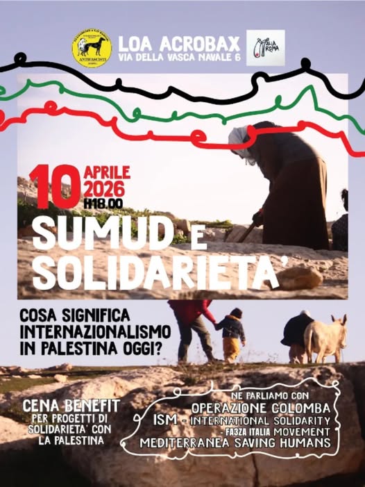 Venerdì 10 aprile 2026 alle 18 al Loa Acrobax in via della Vasca Navale 6 si tiene l'evento Sumud e solidarietà con interventi di attivisti ISM, Operazione Colomba, Mediterranea, Fazɜa Italia Movement e Mediterranea Save Humans.